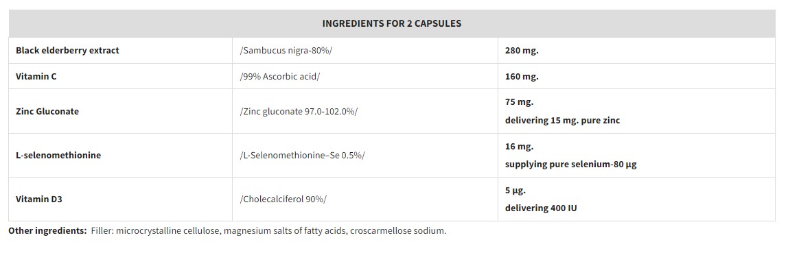 Съставки: Екстракт от Черен бъз/Sambucus nigra-80%/, Аскорбинова киселина – Витамин С /99% Ascorbic acid/, Цинк /Zinc gluconate 97.0-102.0%/, Селен /L-Selenomethionine –Se 0.5%/, Витамин D3 /Cholecalciferol 90%/