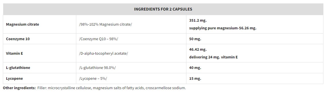 Съставки: Магнезиев цитрат /98%-102% Magnesium Citrate/, Коензим Q10/Coenzyme Q10-98%/, Витамин Е /Tокоферо̀л/, Л-Глутатион /L-glutathione-98.0%/ и Ликопен/Lycopene-5%/