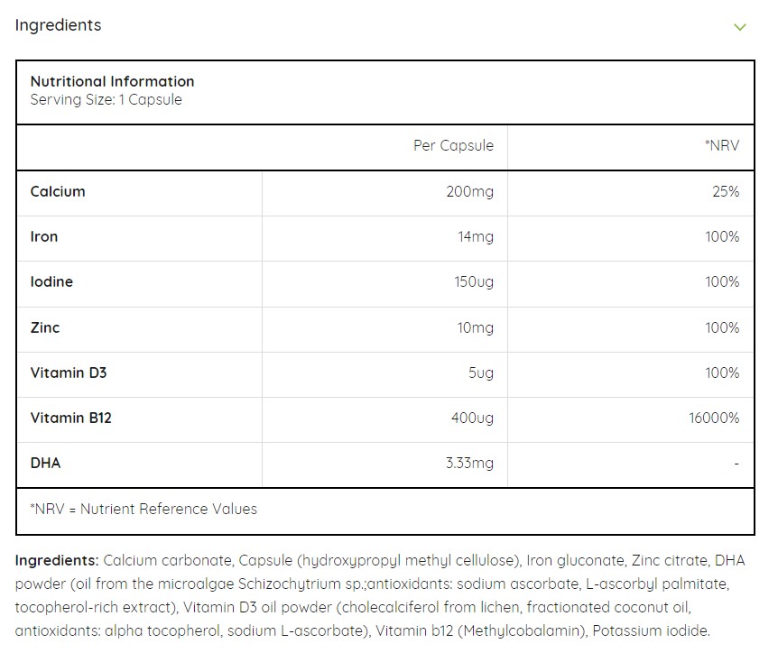 Съставки: Калциев карбонат, капсула (хидроксипропил метил целулоза), железен глюконат, цинков цитрат, DHA на прах (масло от микроводораслото Schizochytrium sp.; антиоксиданти: натриев аскорбат, L-аскорбил палмитат, богат на токоферол екстракт), витамин D3 масло на прах (холекалциферол от лишей, фракционирано кокосово масло, антиоксиданти: алфа токоферол, натриев L-аскорбат, витамин b12 (метилкобаламин), калиев йодид