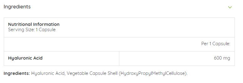 Съставки: Хиалуронова киселина, растителна капсула (хидроксипропилметилцелулоза)