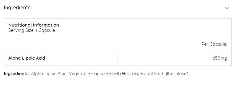 Съставки: Алфа липоева киселина, обвивка на растителна капсула (хидроксипропил метилцелулоза)