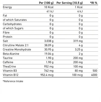Съставки: Бета-аланин, креатин монохидрат, цитрулин малат, таурин, кофеин, теакрин, витамин В3 и Витамин В12