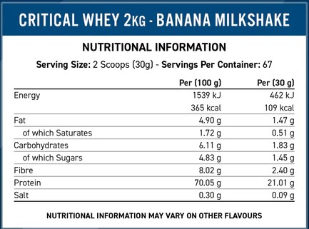 Начин на употреба: Смесете 2 мерителни лъжички (30 гр.) протеин на прах с 250-500 мл. вода или мляко, разклатете добре или смесете с овесена каша или зърнени храни за високопротеинова закуска. Можете да добавяте Critical Whey към всякакви печива – торти, бисвити, мъфини, за да увеличите дневния си прием протеин.