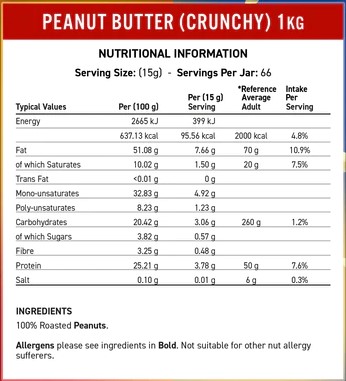 Peanut Butter Crunchy съдържа само и единствено печени фъстъци, които са отличен източник на естествен протеин, здравословни мазнини и фибри. Тези хранителни вещества са от съществено значение за здравето на мускулите, сърцето и храносмилането.
