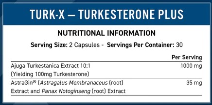Съставки: Екстракт от Ajuga Turkestanica (10:1) (стандартизиран до 10% туркестерон), пълнител (микрокристална целулоза), AstraGin (екстракт от Astragalus Membranaceus (корен) и Panax Notoginseng (корен) екстракт), течлив агент (магнезиев стеарат)