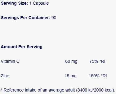 Съставки: Калциев карбонат, набухватели (ди-калциев фосфат, микрокристална целулоза), витамин С, цинков цитрат, антислепващи агенти (силициев диоксид, магнезиев стеарат)