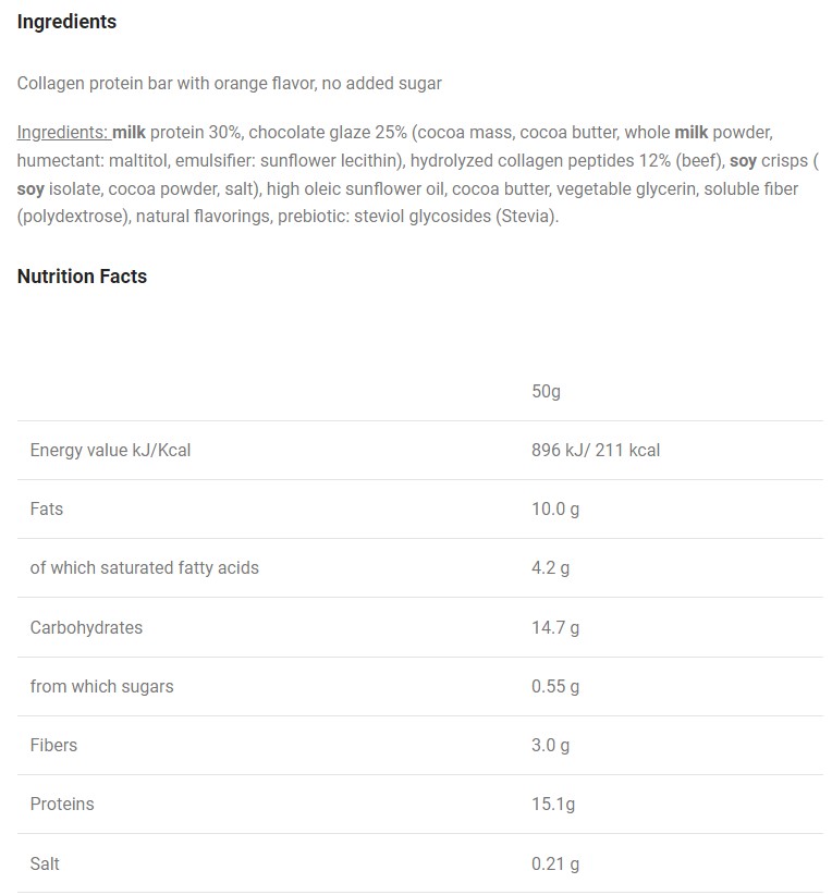 • Всеки бар съдържа 6 гр. колаген и 30% протеин
