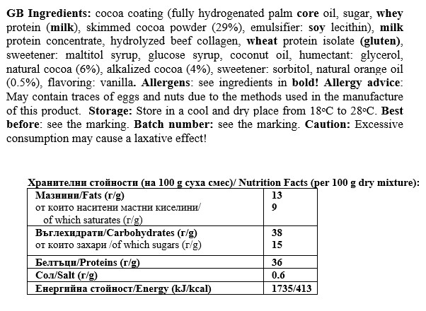Съставки: какаово покритие, напълно хидрогенирано масло от палмова сърцевина, захар, суроватъчен протеин (мляко), обезмаслено какао на прах, емулгатор: соев лецитин, млечен протеин концентрат, хидролизиран телешки колаген, пшеничен протеин изолат (глутен), подсладител: малтитолов сироп, глюкозен сироп, кокос масло, овлажнител: глицерол, натурално какао, алкализирано какао, подсладител: сорбитол, натурално портокалово масло (0,5%), аромат: ванилия