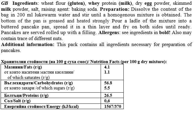 Начин на употреба: Смесете 100 гр. (или колкото ви е необходимо) от продукта с вода или мляко, добавете яйца по избор и си направете най-страхотните палачинки на света.