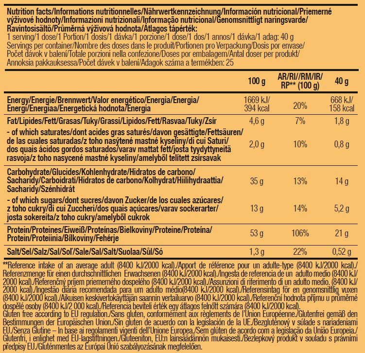 Съставки (вкус шоколад): оризово брашно, суроватъчен протеинов концентрат, хидролизиран протеин, пълномаслено яйце на прах, калциев казеинат (съдържа мляко), обезмаслено мляко на прах, какао на прах с намалено съдържание на мазнини, яйчен белтък на прах, ароматизатори, бакпулвер [набухватели (натриеви карбонати, дифосфати), царевично нишесте], набухвател (натриеви карбонати), сгъстител (ксантанова гума), подсладител (сукралоза). Произведено в предприятие, в което се произвеждат храни, съдържащи мляко, яйца, глутен, соя, ракообразни, серен диоксид и ядки