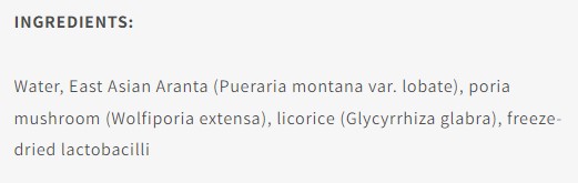 Съставки: Вода, изoточноазиатска аранта, гъба пориа, женско биле,лиофилизирани лактобацили.