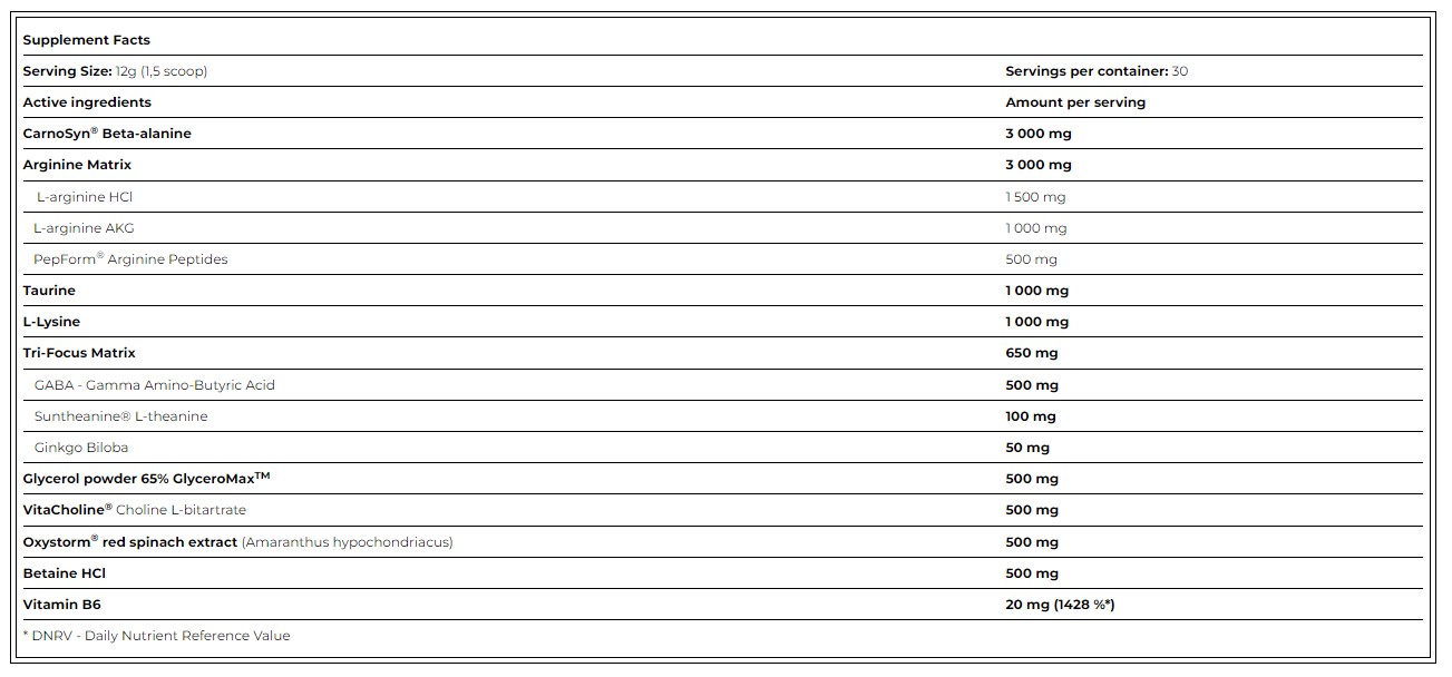 Съставки: CarnoSyn бета-аланин, L-аргинин HCl, L-аргинин AKG, таурин, L-лизин, GABA, бетаин HCl, екстракт от червен спанак Oxystorm, холин L-битартарат VitaCholine, GlyceroMax,PepForm аргинин пептиди, Гинко билоба 4:1, Сунтеанин L-теанин, екстракт от цвекло.
