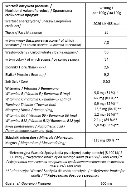 Съставки: Магнезиев цитрат, витамин С, ниацин, витамин Е, витамин В6, тиамин (В1), витамин В12; екстракт от гуарана, натурален екстракт от гуарана, натурален кофеин.