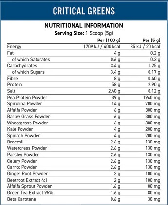 Critical Greens Unflavoured от Applied Nutrition е съвършената добавка за тези, които търсят пълна хранителна подкрепа без неприятни вкусове. Пълен със 17 екстракта от суперзелени растения, включително броколи, целина, спанак, пшенична трева и кейл на прах – които ще ви набавят зеленина по супер удобен начин. Тази смес може просто да се добави към протеиновия шейк, плодовото смути или да се смеси с вода за свеж естествен вкус.