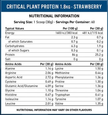 Critical Plant Protein представлява отличен избор за тези, които желаят да повишат приема си на протеини. Обогатен с високо съдържание на разклонена верига аминокиселини (BCAA), като левцин, изолевцин и валин, този вид протеин може да подпомогне растежа и запазването на мускулната маса.