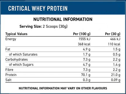 Начин на употреба: Смесете 2 мерителни лъжички (30 гр.) протеин на прах с 250-500 мл. вода или мляко, разклатете добре или смесете с овесена каша или зърнени храни за високопротеинова закуска. Можете да добавяте Critical Whey към всякакви печива – торти, бисвити, мъфини, за да увеличите дневния си прием протеин.