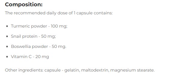 Съставки: Алантоин, куркума, охлювен протеин, босвелия, Витамин C