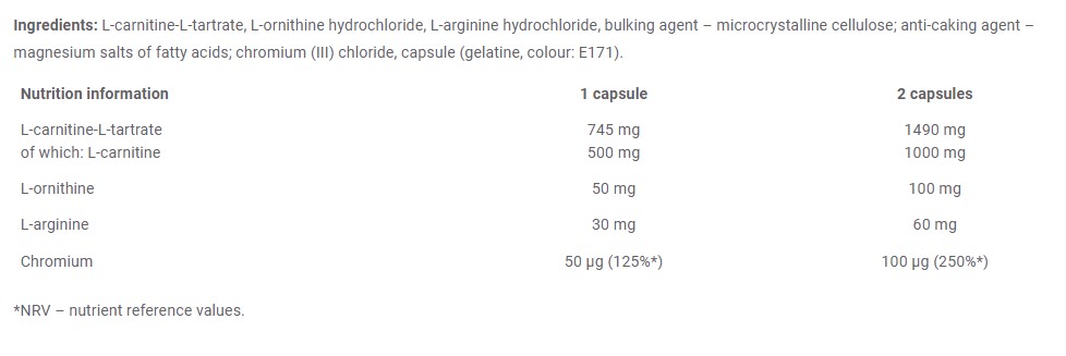 Съставки: L-карнитин, L-аргинин, L-орнитин и хром.