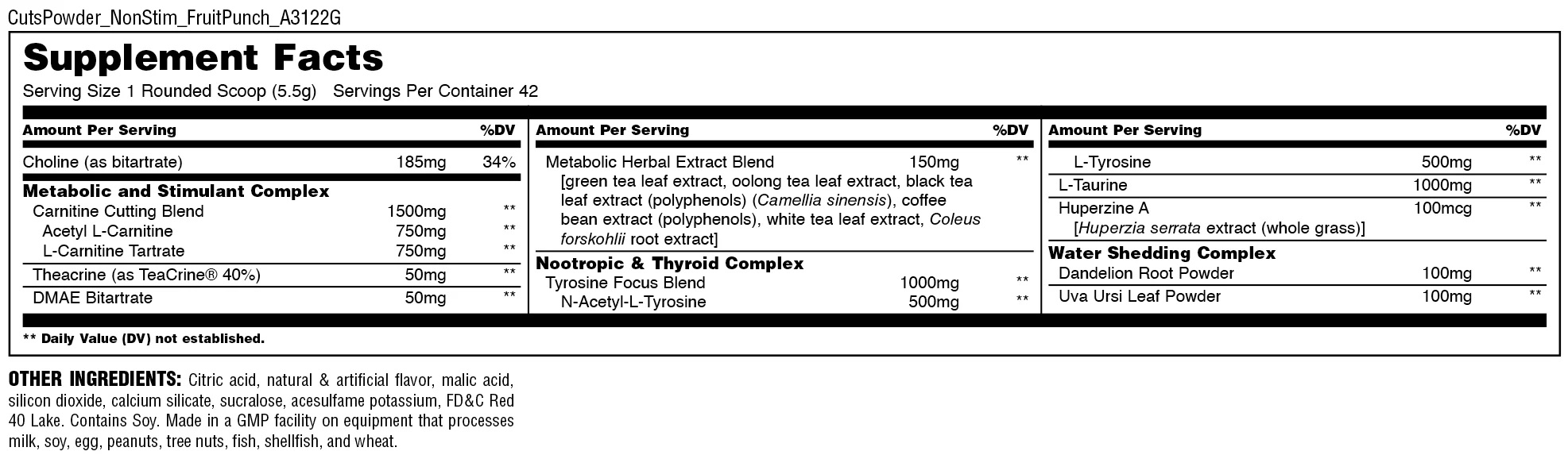 Cuts NS от Universal Animal е безкофеиновата, нестимулираща, прахообразна версия на отличената с награди фетбърбър за изгаряне на мазнини и изчистване със 17 съставки за изгаряне на мазнини, които ускоряват метаболизма, потискат апетита, подпомагат изграждането на мускулите, поддържат здравето на мозъка и подпомагат управлението на теглото.