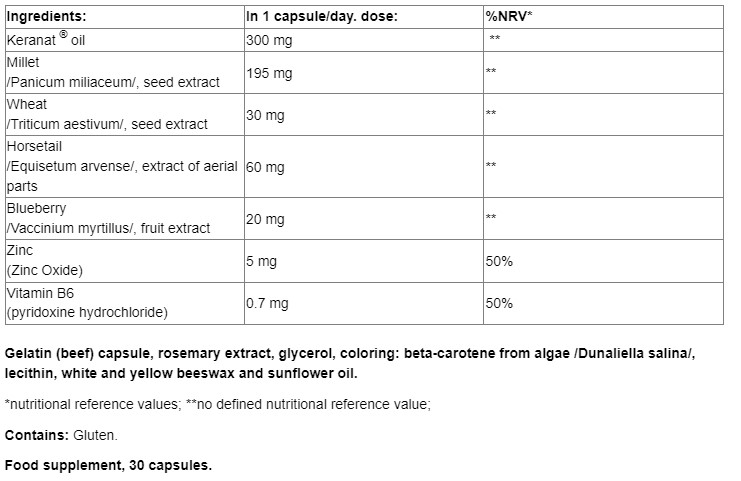 Цинкът и витамин B6 в състава на тази добавка се грижат за добрия външен вид и здраве на косата, защитават клетките от вредното влияние на оксидативния стрес и осигуряват здрава, блестяща и мека коса.