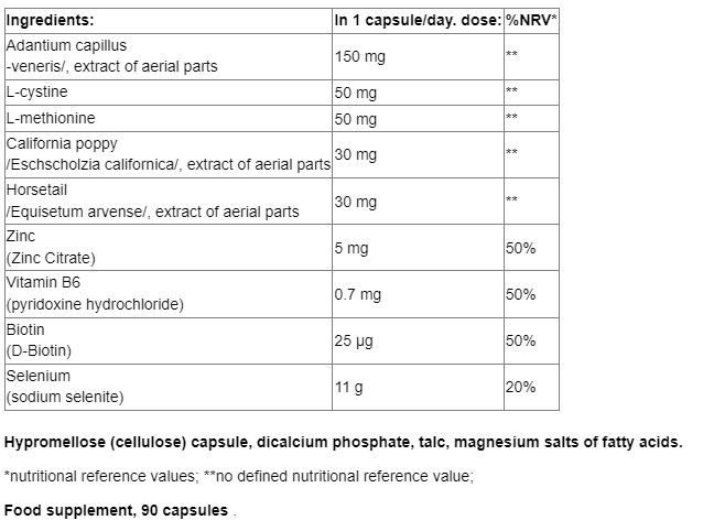 Цинкът и витамин B6 в състава на тази добавка се грижат за добрия външен вид и здраве на косата, защитават клетките от вредното влияние на оксидативния стрес и осигуряват здрава, блестяща и мека коса.