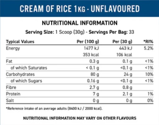 Cream Of Rice от Applied Nutrition съдържа само сложни въглехидрати и това го прави чудесен избор за закуска или snack за през деня, който ще ви засити. Той е подходящ за хора, които спазват хранителен режим и не искат да покачват килограми, но въпреки това обичат да похапват сладичко. Cream Of Rice идва без захар, без мазнини и глутен. Може да бъде комбиниран с плодове или други ваши любими съставки, а може да бъде консумиран и самостоятелно.