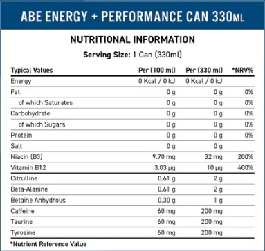 ABE - Energy & Performance от Applied Nutrition ABE е газирана напитка с нулево съдържание на захар, обогатена с 200mg кофеин, цитрулин, бета-аланин, таурин и B-витамини.