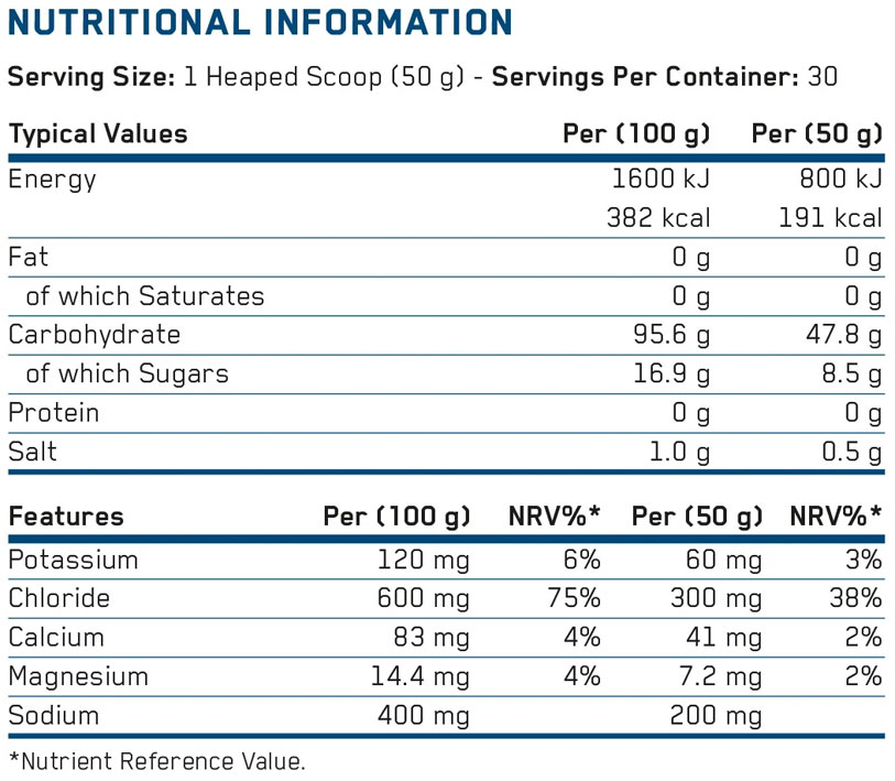 Съставки: Малтодекстрин, фруктоза, лимонена киселина, естествени аромати, натриев хлорид, калциев лактат, калиев хлорид, натриев цитрат, естествен подсладител (стевия), магнезиев цитрат.