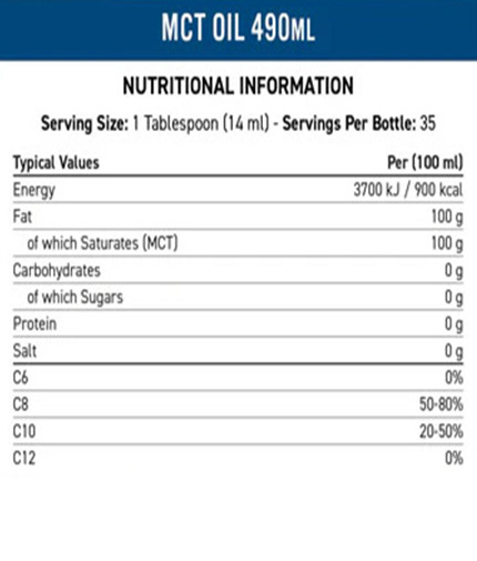 MCT Oil от Applied Nutrition Това е MCT с произход от един източник, с високо съдържание на C8 и C10. Средноверижните триглицериди представляват полезен източник на мастни киселини, които могат да се добавят към кафето, шейковете или върху храни.