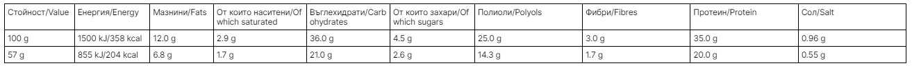ногопластов протеинов бар с три различни неустоими вкуса и подладени с малко захар и подсладители.