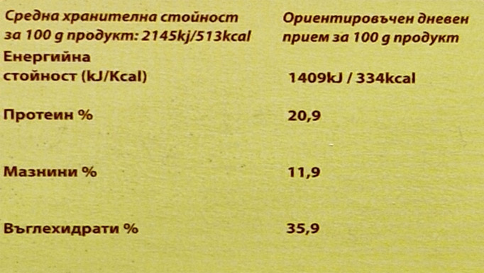 Съставки: Пшеничен брашно, захар, соев изолат, млечен протеин, алкализирано какао, суха сладка суровата, сух пшеничен глутен, пшеничен малкото брашно, псилиум, сол, консервант калиев сорбат и натриев бензоат емулгатор (моно и диглецериди на мастни киселини), набухватели (бакпулвер), ароматизанти, подсладител (сукралоза).