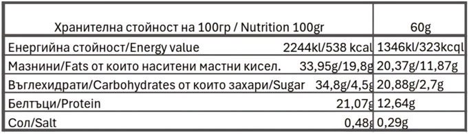 Съставки: Крем 49% ( суроватъчен протеин, нехидратирано палмово масло, подсладител ( мелтитол, какао на прах 8%, емулгатор соев лецитин, стевия), лешници 10%, глазура 39% ( суроватъчен протеин, нехидратирано палмово масло), подсладител ( малтитол, какао на прах 4%, какао маса 4%, емулгатор соев лецитин, стевия), вафлени кори 12% (питейна вода, пшеничено брашно тип 500, набухвател: сода бикарбонат, сол).