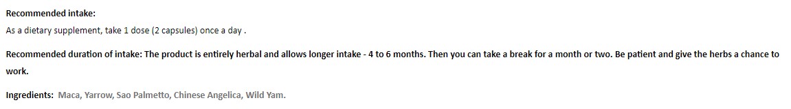Препоръчителен прием: 1 доза на ден. Продуктът е изцяло на билкова основа и позволява по-продължителен прием - 4 до 6 месеца. След това може да направите пауза от месец или два. Бъдете търпеливи и дайте шанс на билките да подействат.
