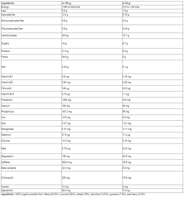 Съставки:100% органичен прах от: Мака (22.5%), лукума (20%), пшеница (15%), спирулина(12.5%), гуарана(7.5%), акай бери(2.5%).