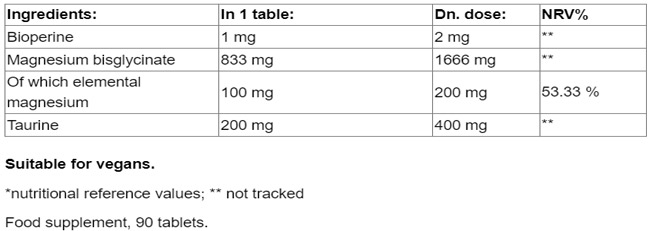 Съставки: Магнезиев бисглицинат, таурин, биоперин (екстракт от черен пипер)
