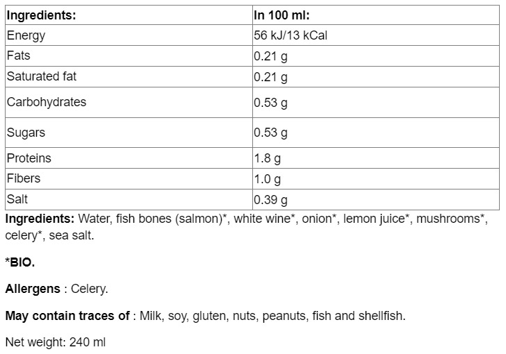 Съставки: Вода, рибни кости (от сьомга), бяло вино, лук, лимонов сок, гъби, целина, морска сол.