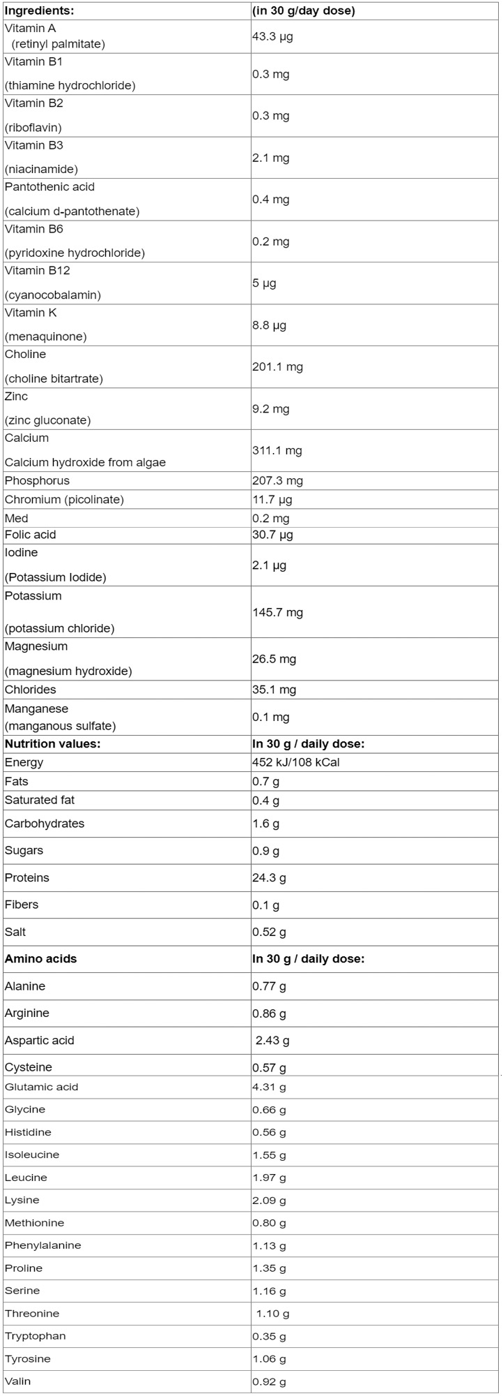 в 100 гр. от този продукт се съдържат 78 гр.растителен протеин от морски водорасли - хлорела и спирулина;