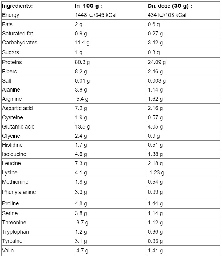 Начин на употреба: Смесете 2 супени лъжици (около 30 g) в блендер, миксер или шейкър с 250 ml вода, плодов сок или смути. Може да се използва и като допълнителна добавка в мюсли или супа.