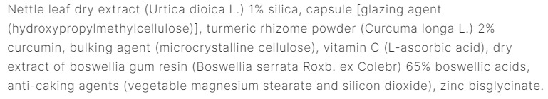 Съставки:Сух екстракт от листа на коприва (Urtica dioica L.) 1% силициев диоксид, капсула [глазиращ агент (хидроксипропилметилцелулоза)], прах от коренището на куркума (Curcuma longa L. ) 2 % куркумин, набухвател (микрокристална целулоза), витамин С (L-аскорбинова киселина), сух екстракт от смола на босвелия (Boswellia serrata Roxb. ex Colebr) 65 % босвелиеви киселини, антислепващи агенти (растителен магнезиев стеарат и силициев диоксид), цинков бисглицинат. *VRN: Референтна стойност на хранителните вещества.