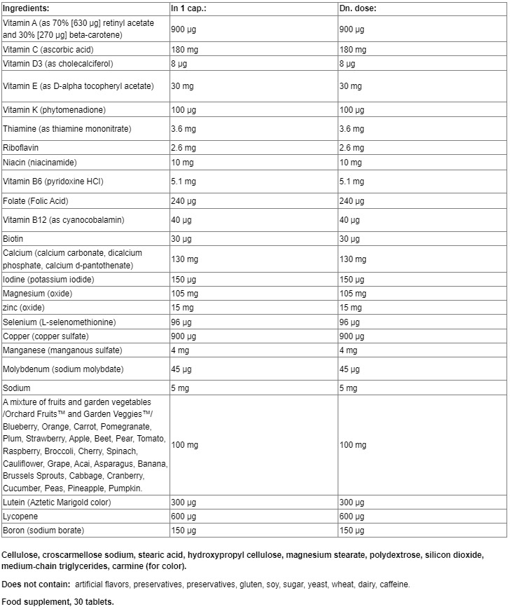 Съставки:Витамин А (ретинил ацетат, бета-каротин), Витамин С (аскорбинова киселина), Витамин D3 (холекалциферол), Витамин Е (D-алфа токоферил ацетат), Витамин К (фитоменадион), Тиамин (тиамин мононитрат), Рибофлавин, Ниацин (ниацинамид), Витамин В6 (пиридоксин HСI), Фолат (фолиева киселина), Витамин В12 (цианокобаламин), Биотин, Калций (калциев карбонат, дикалциев фосфат, калциев d-пантонтенат), Йод (калиев йодид), Магнезий (оксид), Цинк (оксид), Селен (L-селенометионин), Мед (меден сулфат), Манган (манганов сулфат), Молибден (натриев молибдат), Натрий, Смес от плодове и градински зеленчуци (синя боровинка, портокал, морков, нар, слива, ягода, ябълка, цвекло, круша, домат, малина, броколи, череша, спанак, карфиол, грозде, акай, аспержи, банан, брюкселско зеле, зеле, червена боровинка, краставица, грах, ананас, тиква), Лутеин (цвят от ацтетски невен), Ликопен, Бор (натриев борат).