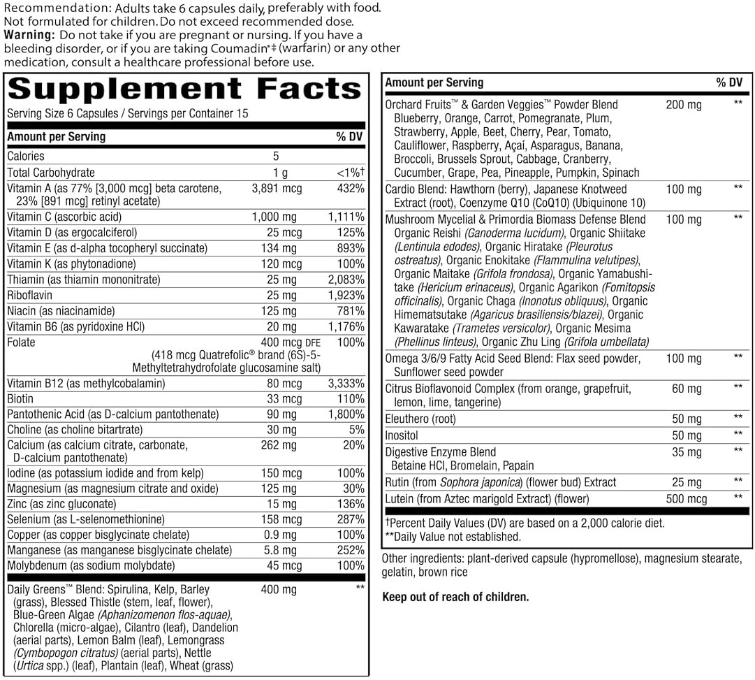 Съставки:Витамин А, Витамин С, Витамин D, Витамин Е, Витамин К, Тиамин, Рибофлавин, Ниацин, Витамин В6, Фолат, Витамин В12, Биотин, Пантотенова киселина, Холин, Калций, Йод, Магнезий, Цинк, Селен, Мед, Манган, Молибден, Калий, Смес от зелени храни, Смес от плодове и зеленчуци, Смес за сърдечно-съдова система, Храносмилателни ензими, Омега 3/6/9 мастни киселини, Смес от мицелни гъби, Цитрусов биофлавоноиден комплекс, Сибирски женшен, Инозитол, Рутин, Лутеин