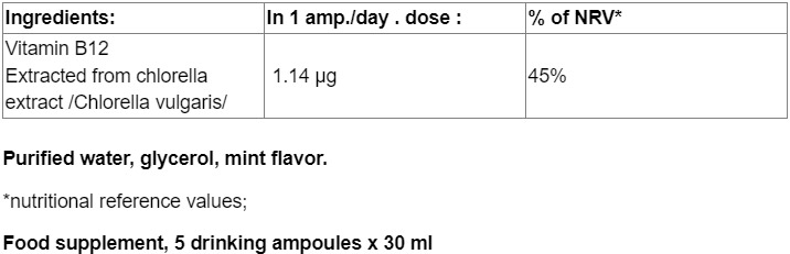Съставки: Витамин В12 извлечен от екстракт от хлорела /Chlorella vulgaris/, пречистена вода, глицерол, аромат на мента.