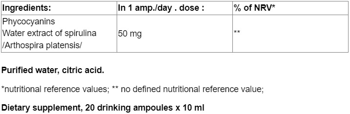 Spirulysat Concentrate съдържа екстракт от спирулина, богат на фикоцианини, които имат антиоксидантни свойства и подпомагат защитата на клетките от оксидативен стрес. Продуктът е без добавени захари и има концентрирана формула, което го прави удобен за ежедневна употреба.
