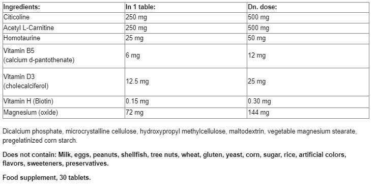 Съставки:Гинко билоба, Коензим Q10, Фосфатидилсерин, итамин B-комплекс