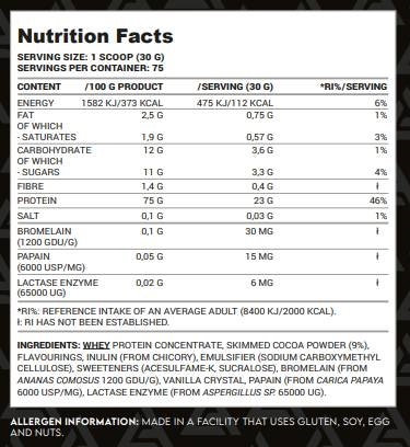 Съставки: суроватъчен протеин концентрат, обезмаслено какао на прах, овкусители, инулин, сгъстител, подсладител (ацесулфам-К и сукралоза), бромелаин, ванилови кристали, папаин, лактаза
