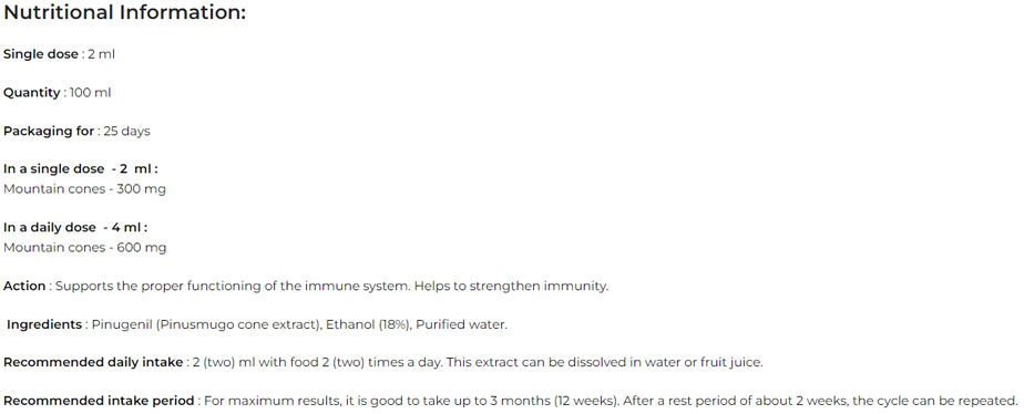 Екстрактът съдържа Pinugenil от планински борови шишарки (Pinus mugo), който подпомага защитните механизми на организма и повишава устойчивостта към външни влияния. Продуктът се препоръчва за прием по 2 мл два пъти дневно, като може да се приема до 3 месеца, след което се прави почивка.