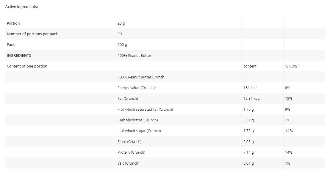Продуктът съдържа 100% фъстъчено масло с хрупкава текстура, богато на протеин и полезни мазнини, които подпомагат възстановяването и енергийния баланс. Високото съдържание на фибри спомага за доброто храносмилане, а ниското количество захар го прави подходящ избор за здравословно хранене.