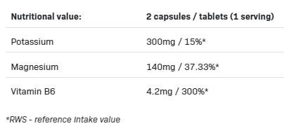 Съставки: Калий – 300 mg, Магнезий – 140 mg, Витамин B6 – 4.2 mg