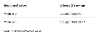 Продуктът комбинира витамин D, който участва в усвояването на калций и в поддържането на нормална костна структура, с витамин K, който подпомага правилното използване на калция в организма и допринася за нормалното кръвосъсирване. Течната форма улеснява приемането и усвояването от организма.