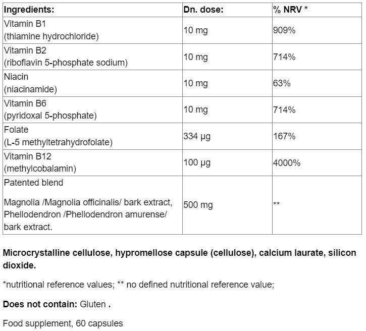 Съставки: Витамин B1, Витамин B2, Ниацин, Витамин B6, Фолати, Витамин B12, екстракт от кора на магнолия, екстракт от кора на пеллодендрон амуренсe